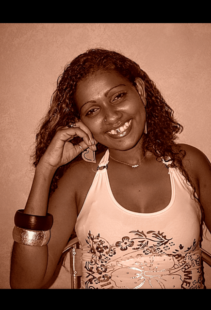 @Radio_Azureus The image features a woman with a warm, joyful expression, smiling directly at the camera. She has long, curly hair and is wearing a sleeveless top with a floral design and the word "FAME" printed on it. The top is light-colored, possibly white or cream, with a halter neck style. She accessorizes with a heart-shaped earring, a delicate necklace, and a large, chunky bangle on her left wrist. Her right hand is raised to her ear, holding a heart-shaped object, possibly an earring. The background is a plain, neutral color, providing a simple backdrop that highlights the subject. The sepia tone of the image gives it a warm, vintage feel.